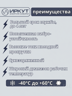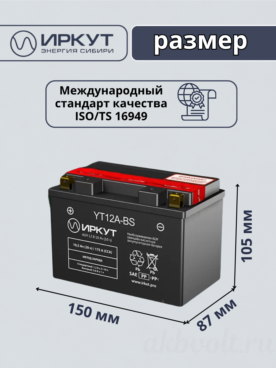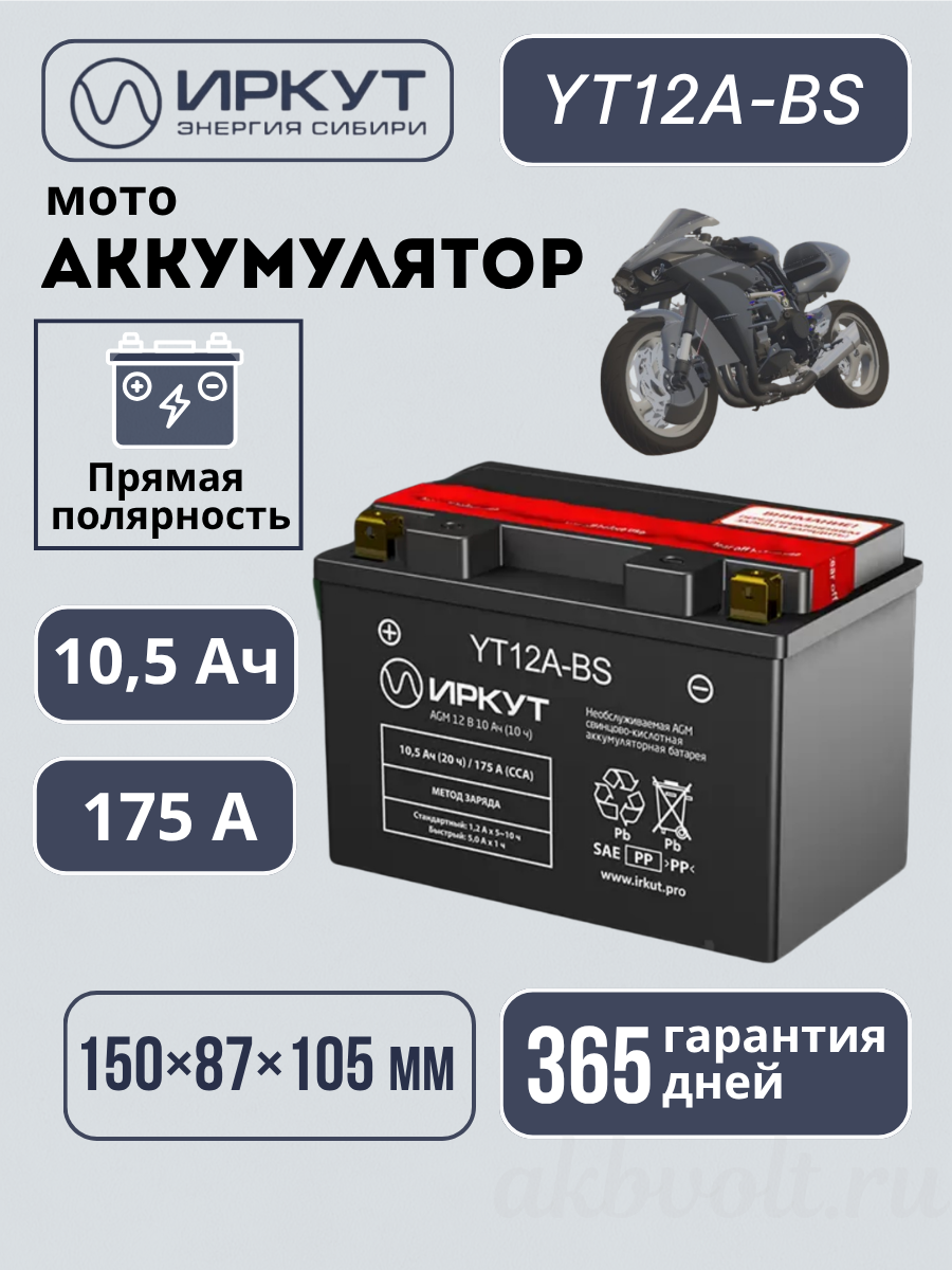 Сухозаряженный Аккумулятор мото AGM ИРКУТ 10.5Ач прямая полярность YT12B-BS производятся в соответствии с российским стандартом ГОСТ Р 53165-2008.