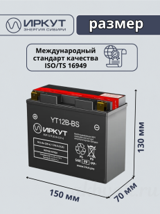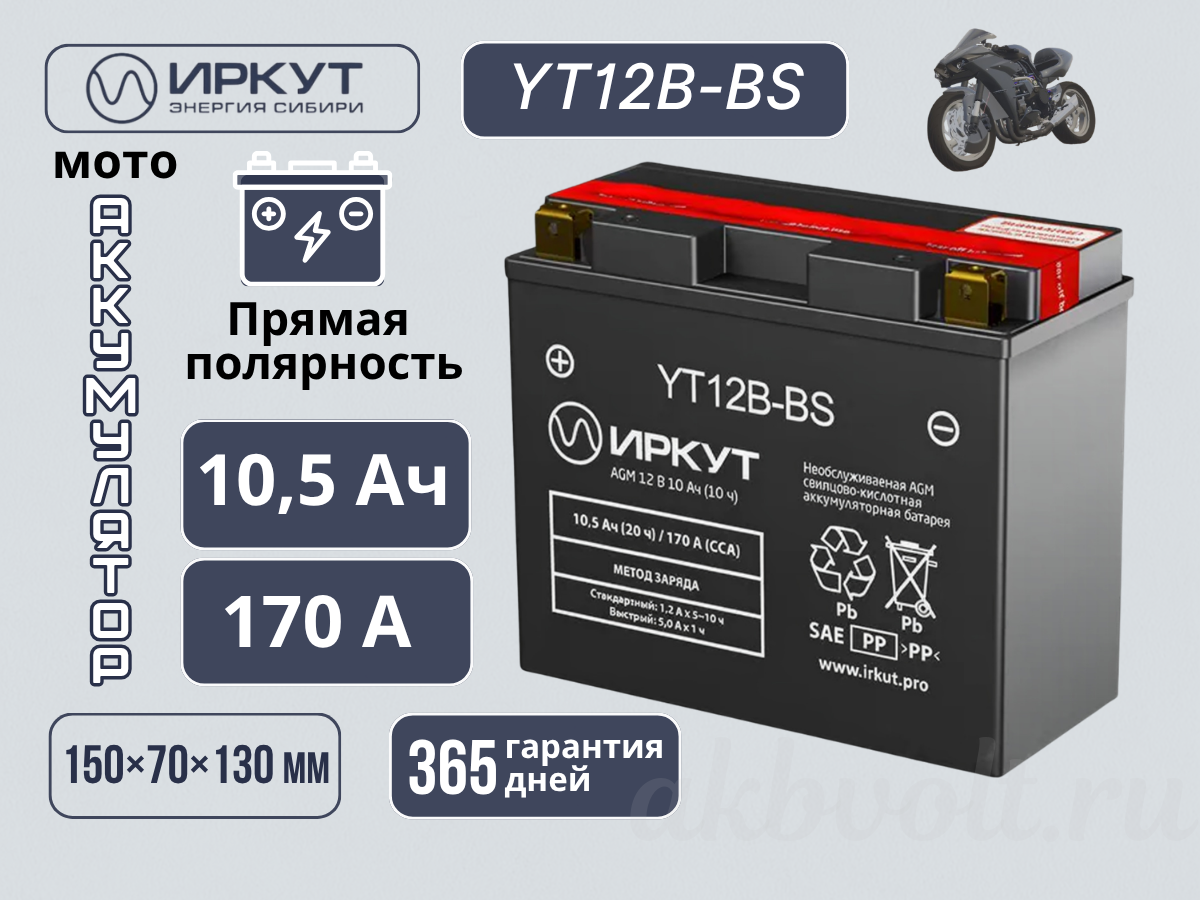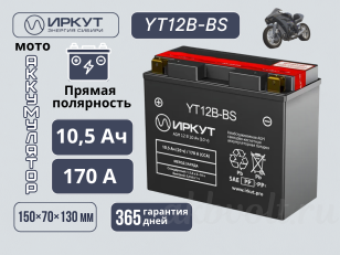 Сухозаряженный Аккумулятор мото AGM ИРКУТ 10.5Ач прямая полярность YT12B-BS производятся в соответствии с российским стандартом ГОСТ Р 53165-2008.