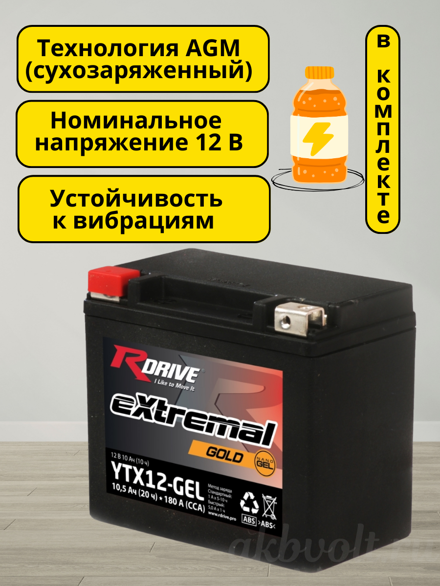 Мото аккумулятор RDrive eXtremal GOLD 10Ач прямая полярность YTX12-GEL