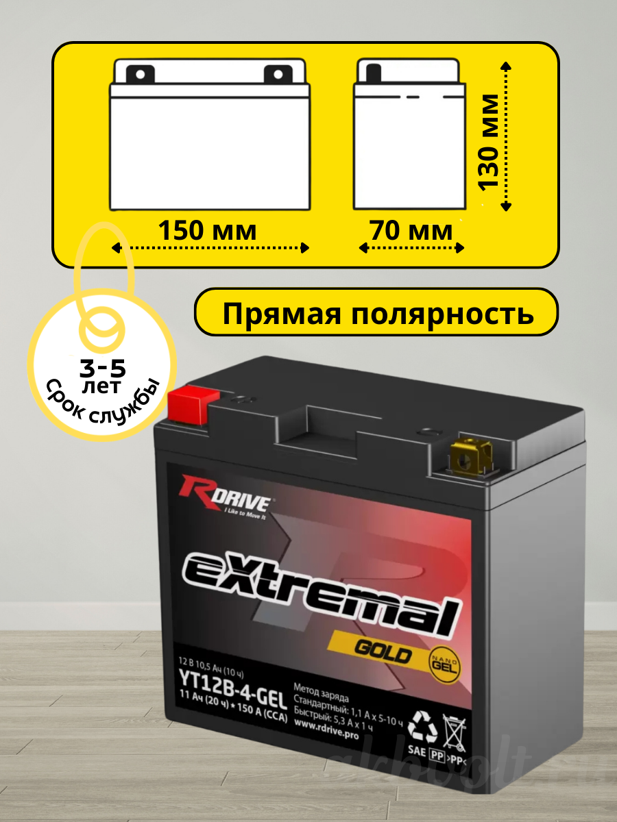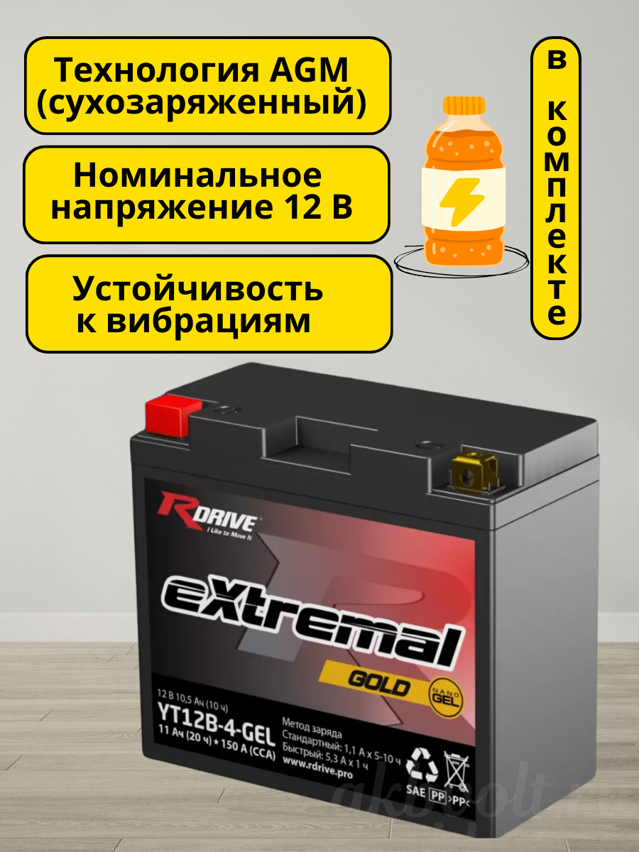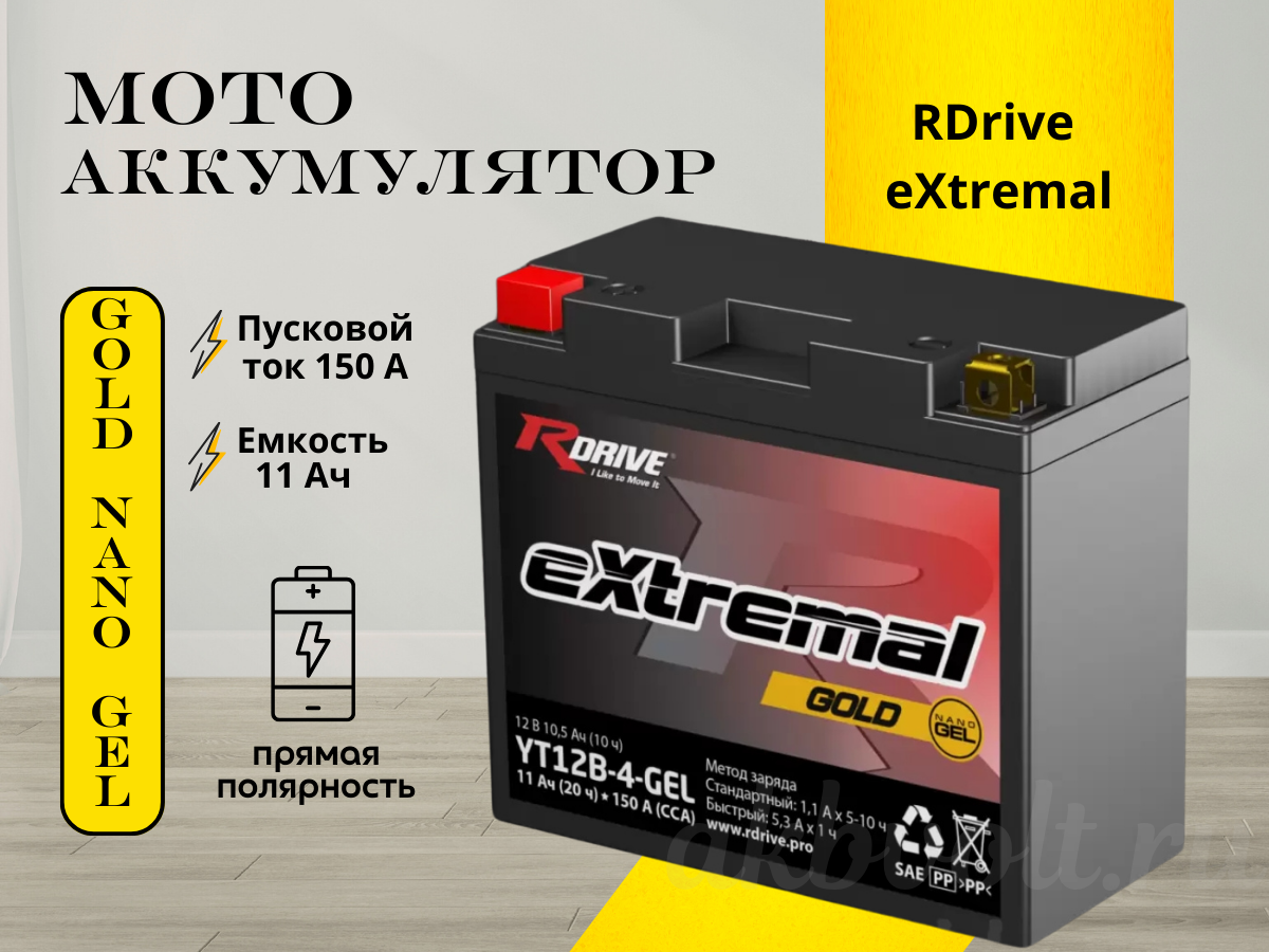 Аккумулятор RDrive eXtremal Gold 11Ач 150А прямая полярность YT12B-4-GEL: Непревзойденная мощность и надежность для экстремальных условий