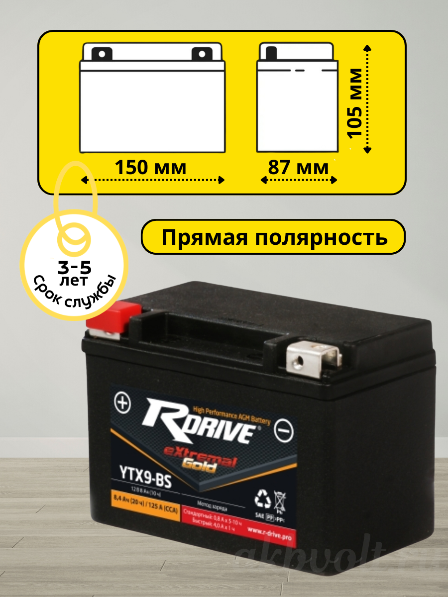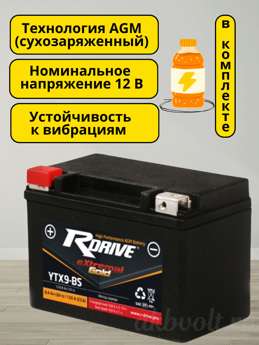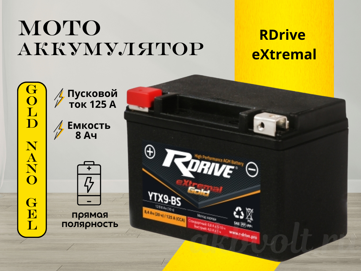 Мото аккумулятор RDrive eXtremal GOLD 8Ач прямая полярность YTX9-BS
