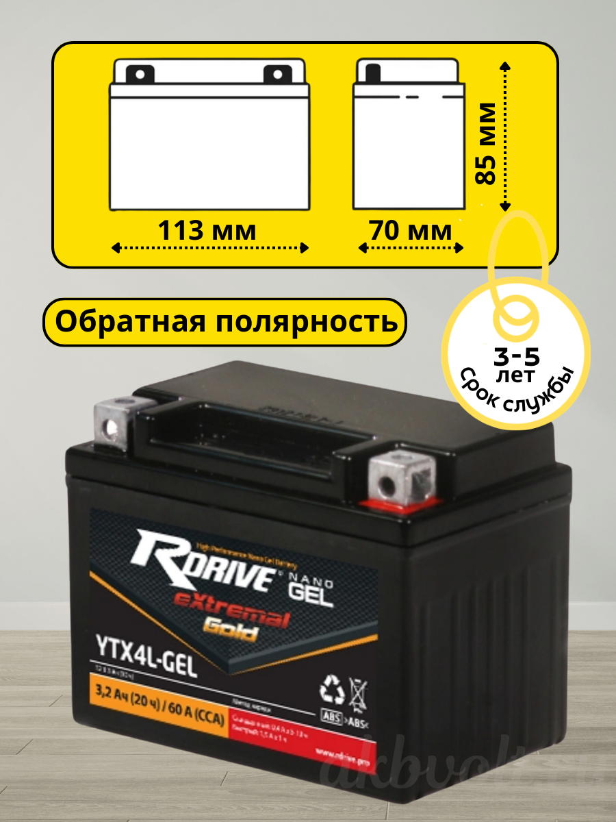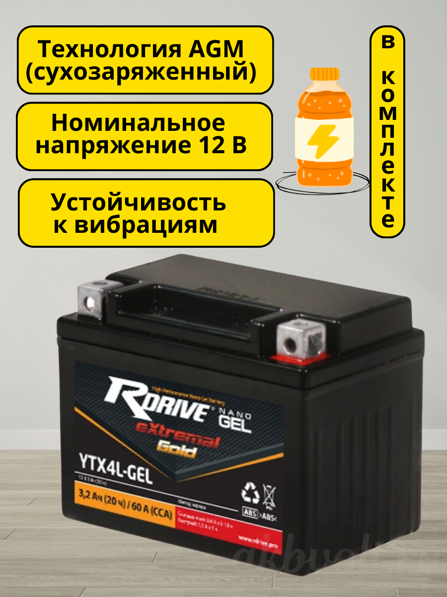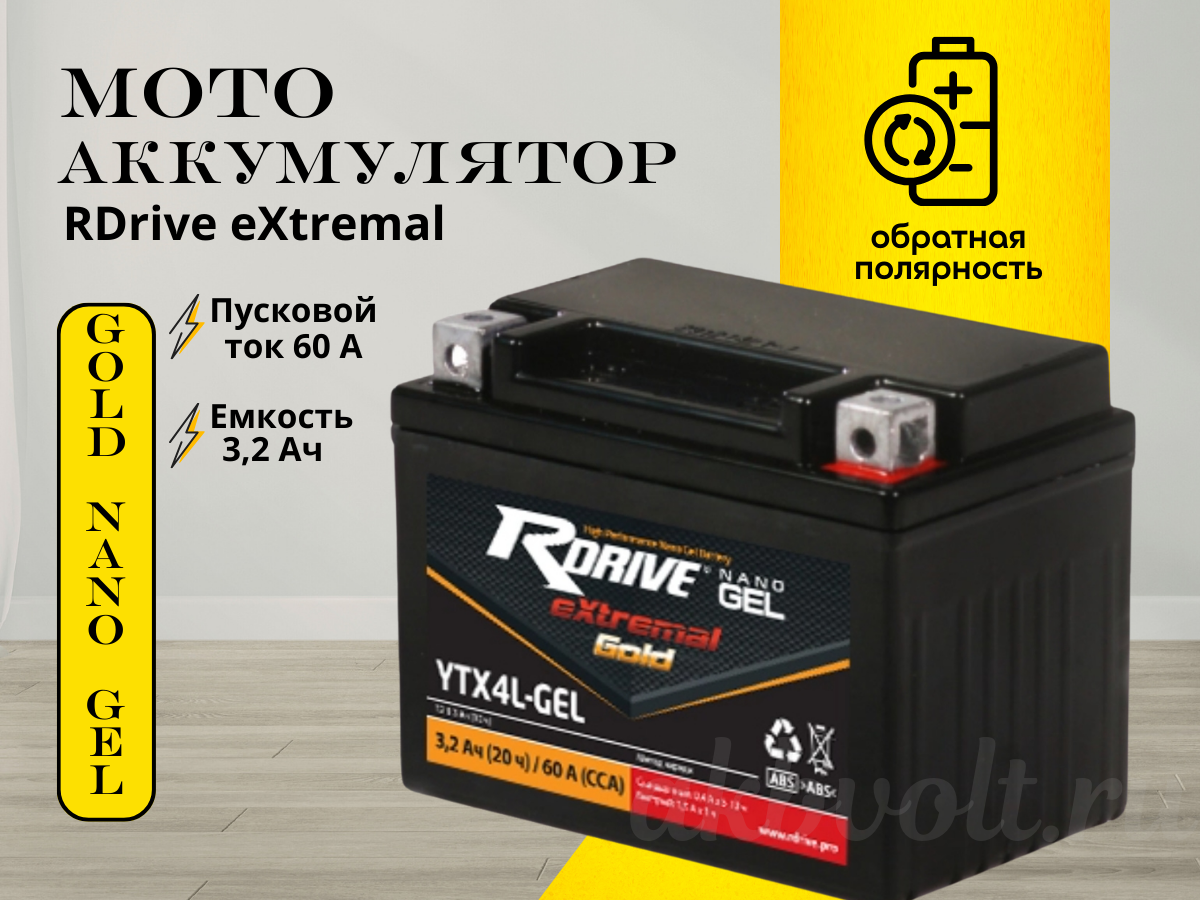 Мото аккумулятор RDrive eXtremal Gold NANO GEL 3.2Ач обратная полярность YTX4L-GEL