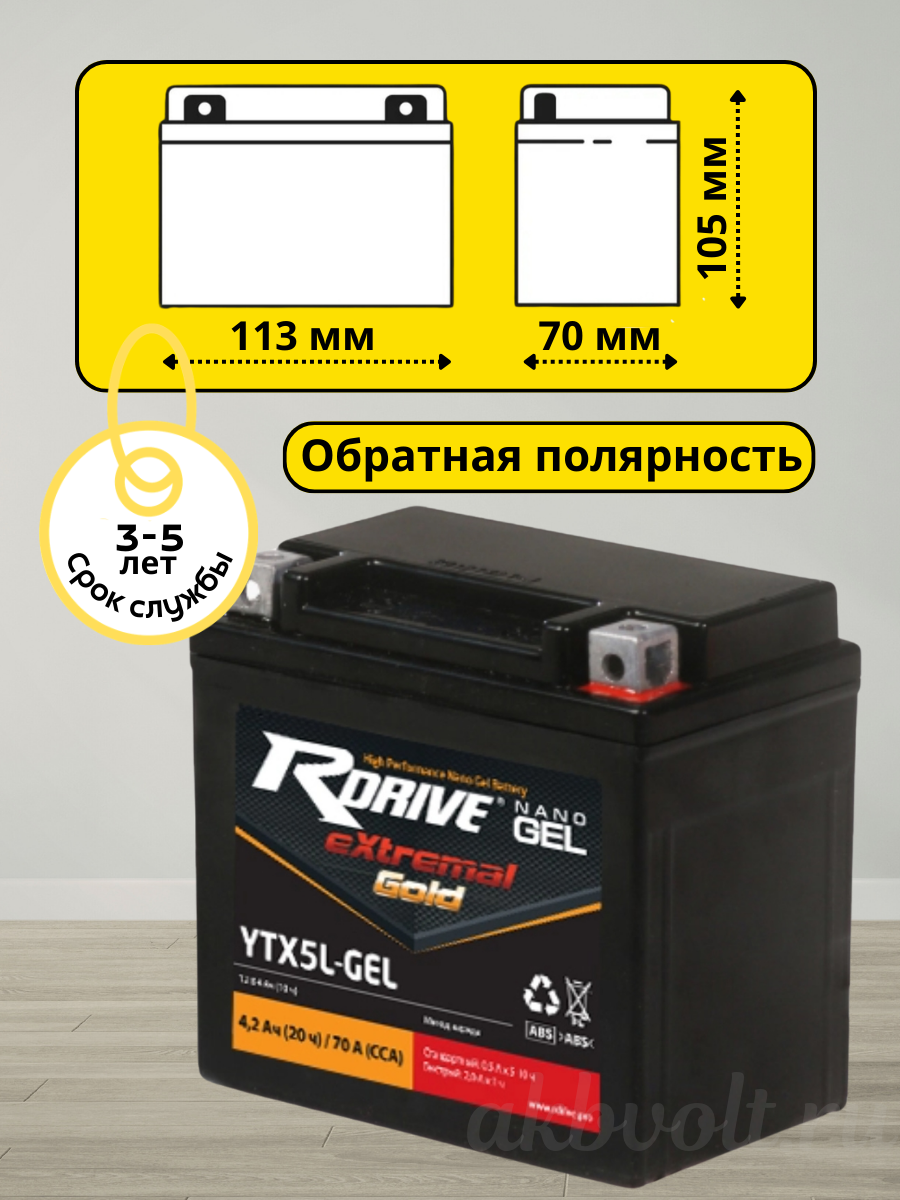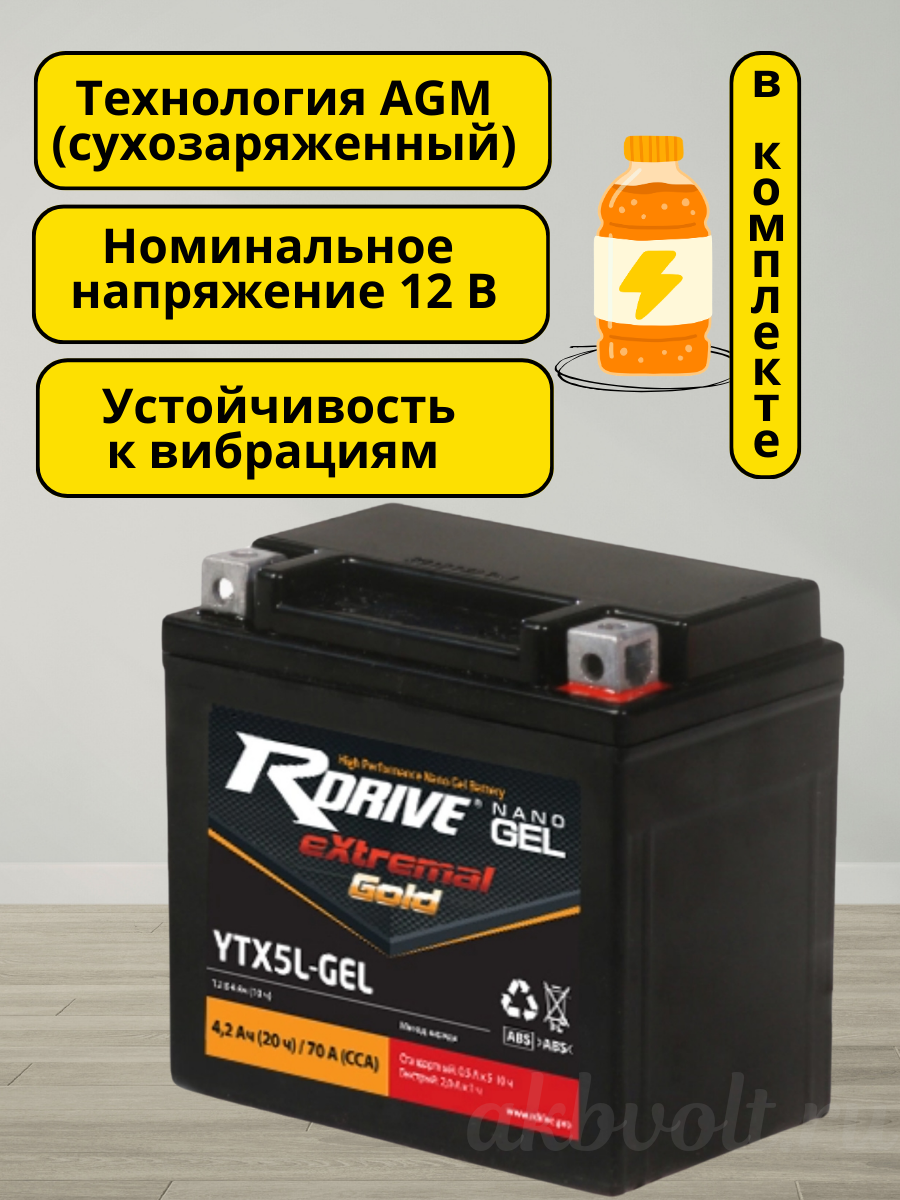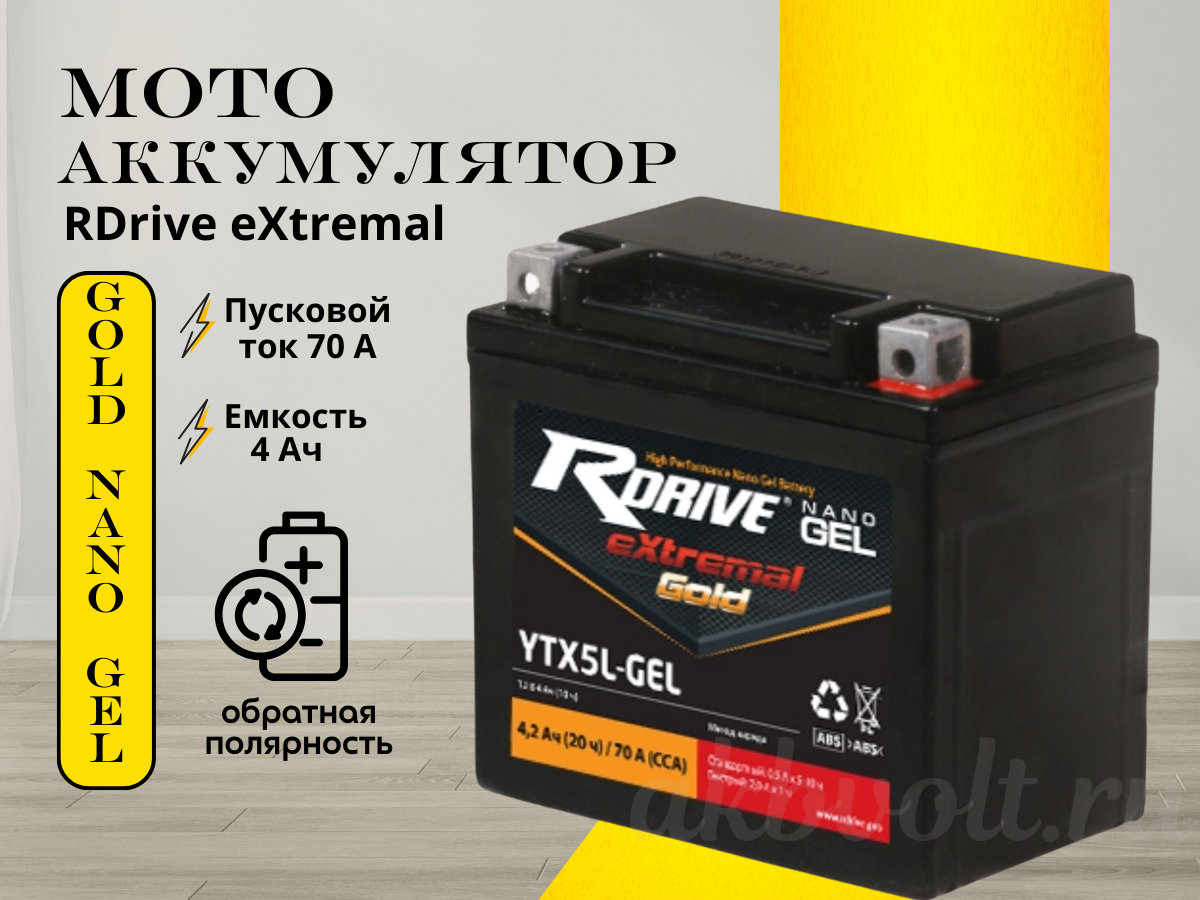 Мото аккумулятор RDrive eXtremal Gold NANO GEL 4Ач обратная полярность YTX5L-GEL