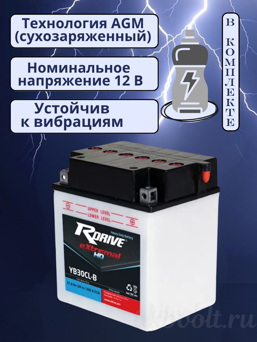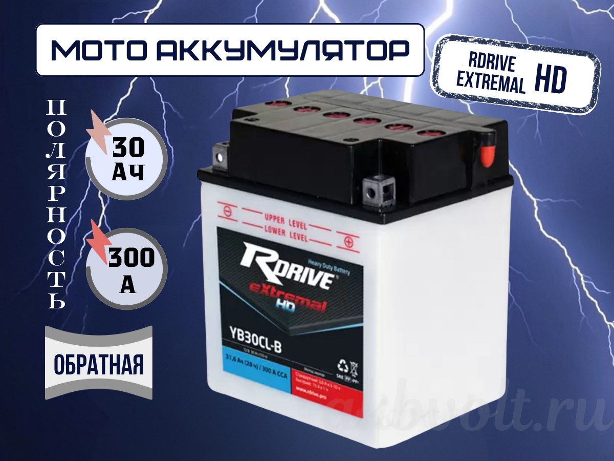 Мото аккумулятор RDrive eXtremal HD 30Ач обратная полярность YB30CL-B