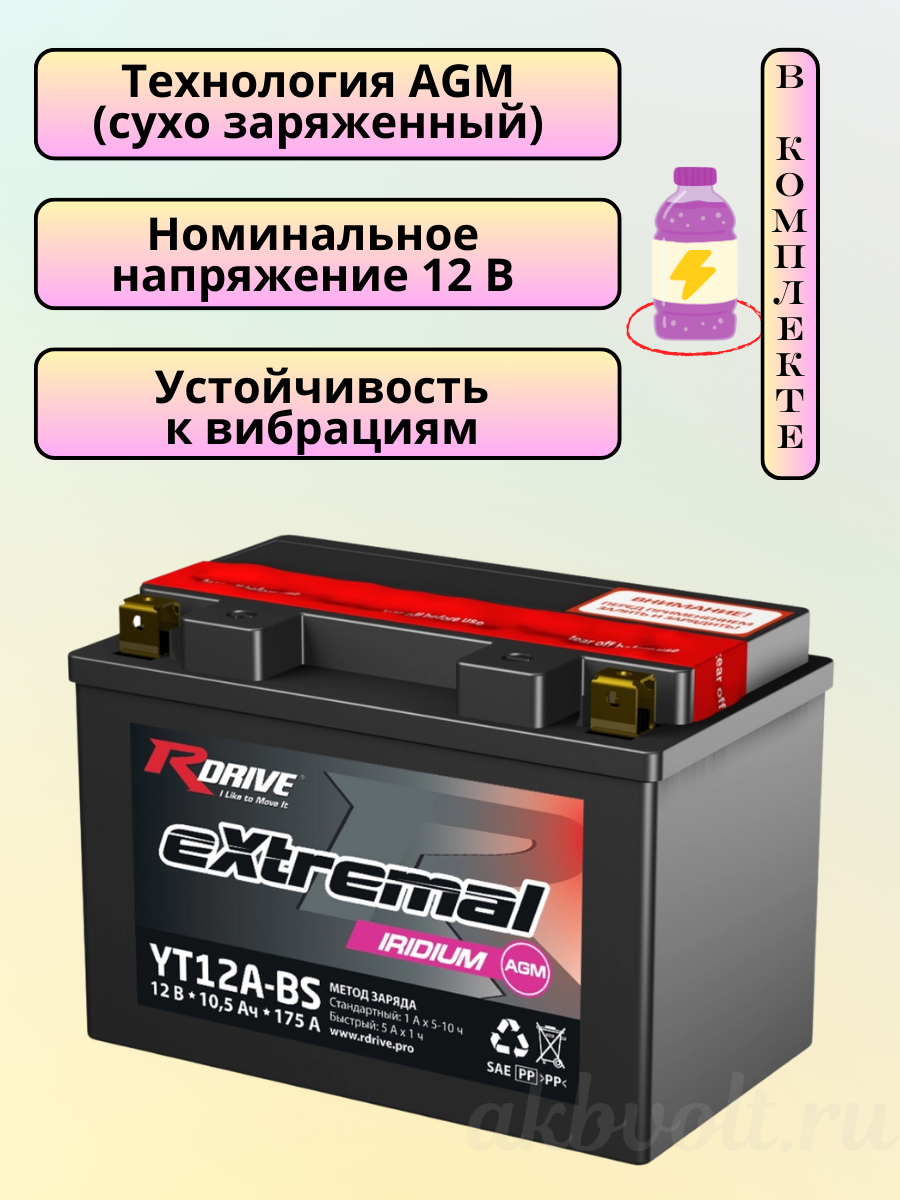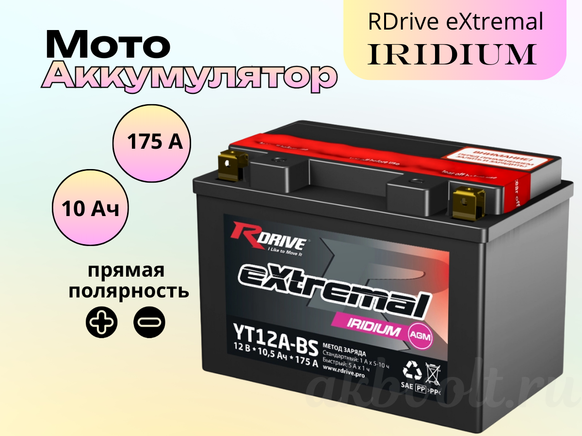 Мото аккумулятор RDrive eXtremal IRIDIUM 10Ач прямая полярность YT12A-BS