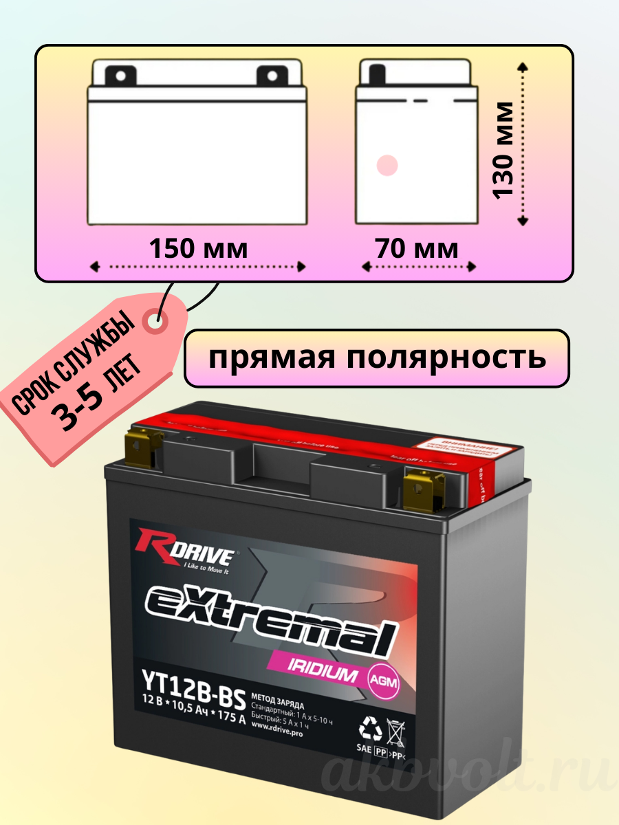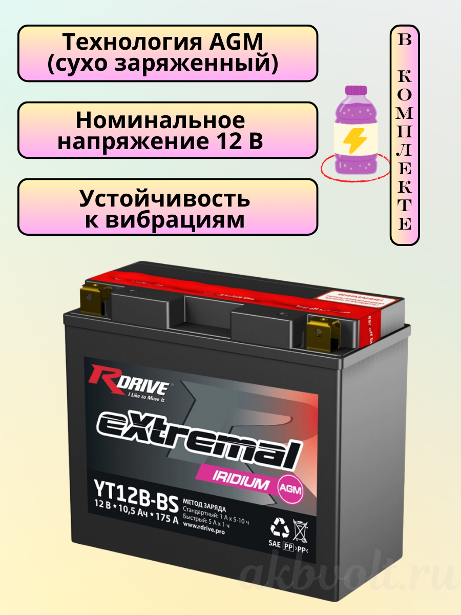 Мото аккумулятор RDrive eXtremal IRIDIUM 10Ач прямая полярность YT12B-BS