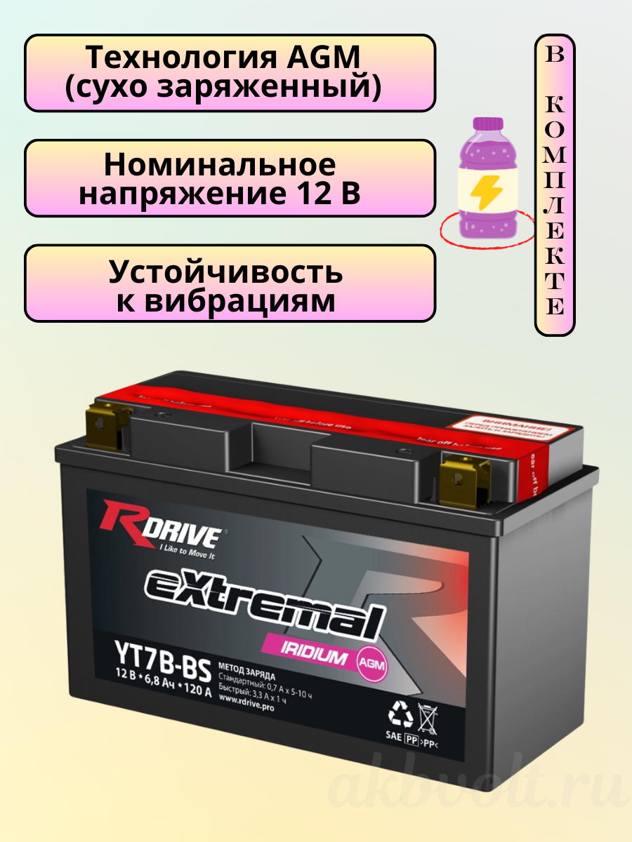 Аккумулятор RDrive eXtremal IRIDIUM 6.5Ач с прямой полярностью YT7B-BS — это воплощение передовых технологий и надежности, созданное для самых требовательных владельцев мототехники. Представляя собой герметизированную, сухозаряженную аккумуляторную батарею, он поставляется в комплекте с высококачественным электролитом, обеспечивая максимальную производительность и долговечность.