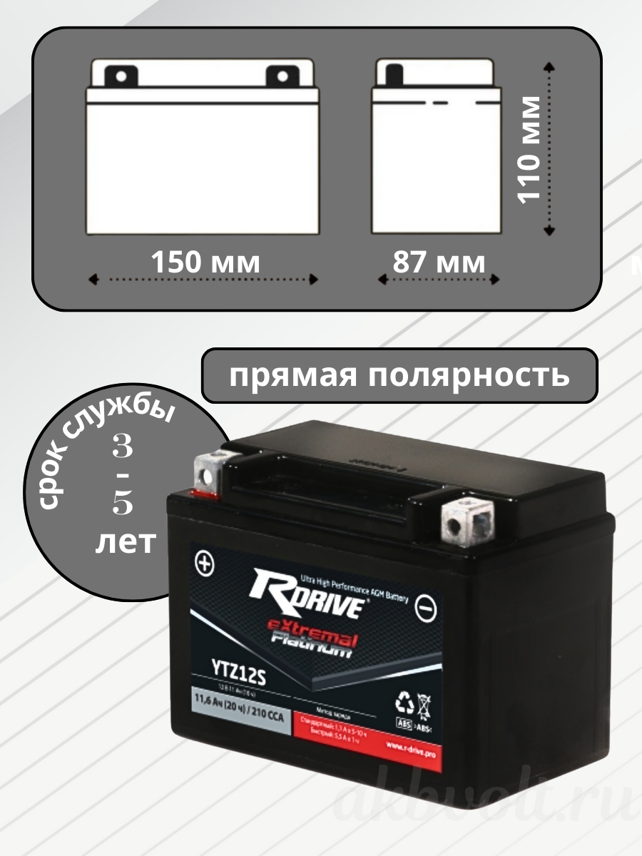 RDrive eXtremal PLATINUM 11Ач с прямой полярностью YTZ12S — это вершина инженерной мысли в области источников питания для мототехники. Этот аккумулятор — не просто компонент, а сердце вашей машины, готовое биться с неукротимой силой, обеспечивая стабильную работу даже в самых экстремальных условиях. Его сухозаряженная конструкция гарантирует длительное хранение без потери мощности, а технология AGM (Absorbent Glass Mat) выводит производительность на принципиально новый уровень.