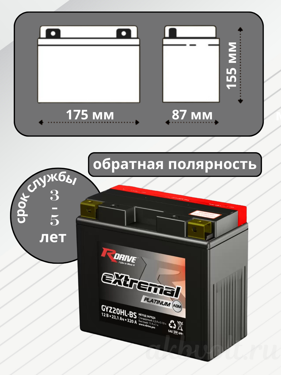Аккумулятор RDrive eXtremal PLATINUM 22Ач обратная полярность GYZ20HL-BS сухозаряженный представляет собой воплощение передовых технологий и надежности, разработанное для самых требовательных условий эксплуатации. Этот аккумулятор предназначен для мототехники, снегоходов, квадроциклов и другой техники, нуждающейся в мощном и стабильном источнике питания.