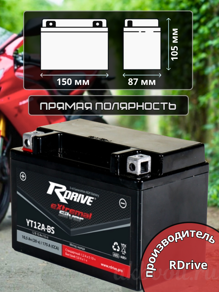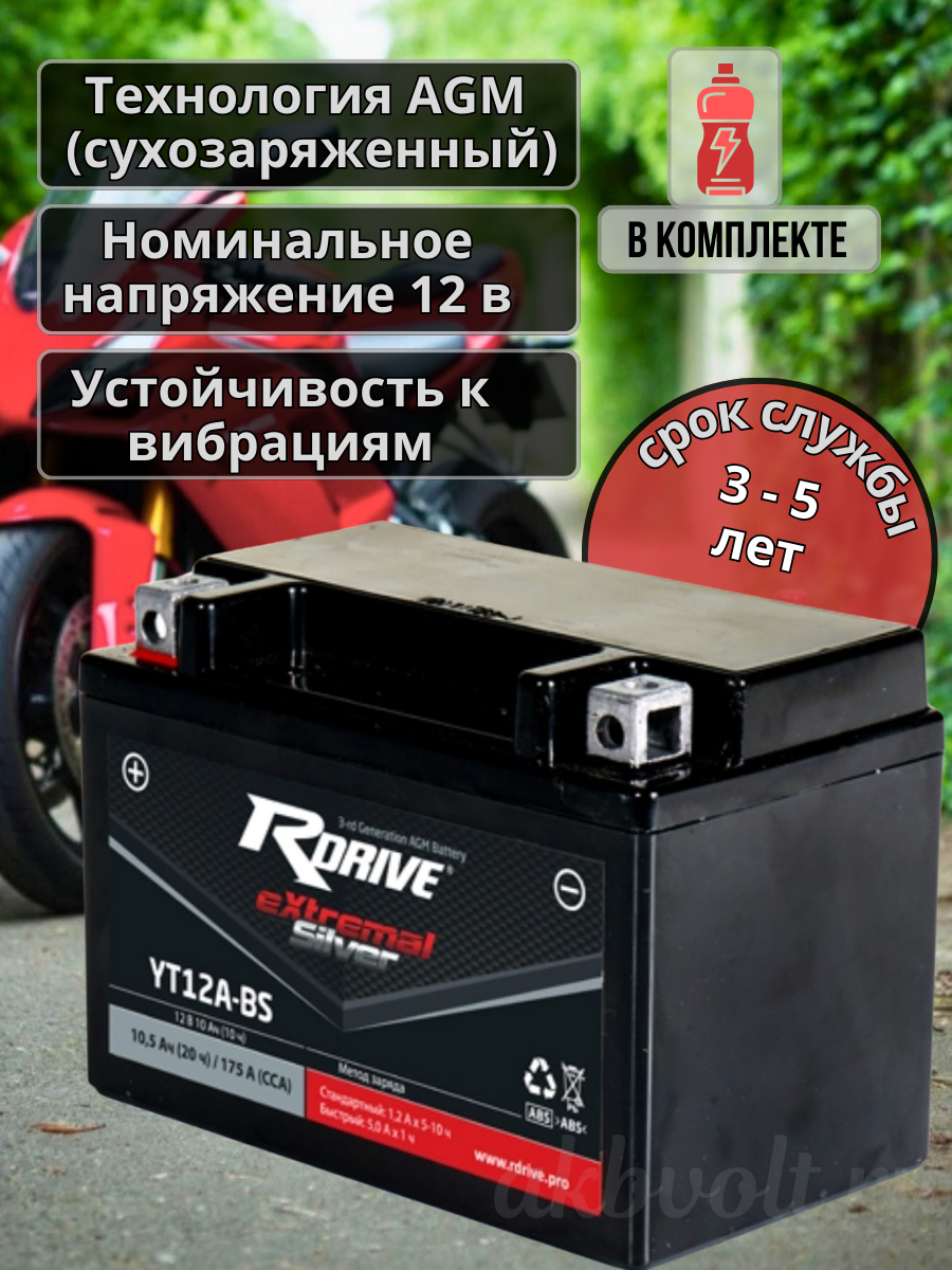 Мото аккумулятор RDrive eXtremal SILVER 10Ач прямая полярность YT12A-BS