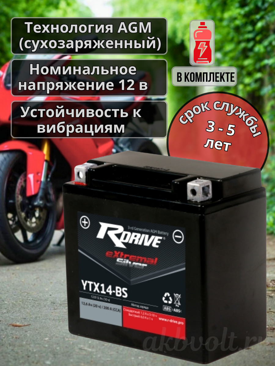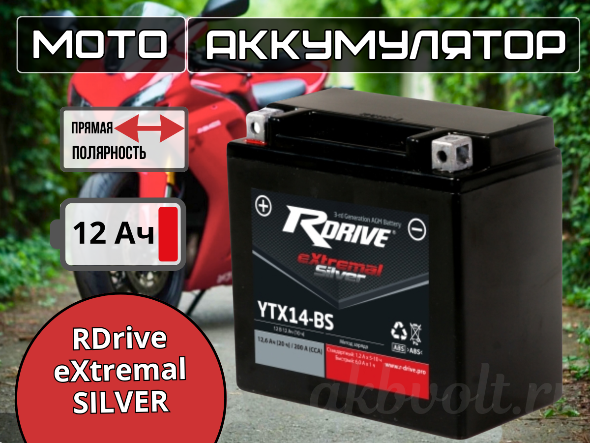 Мото аккумулятор RDrive eXtremal SILVER 12Ач обратная полярность YTX14L-BS