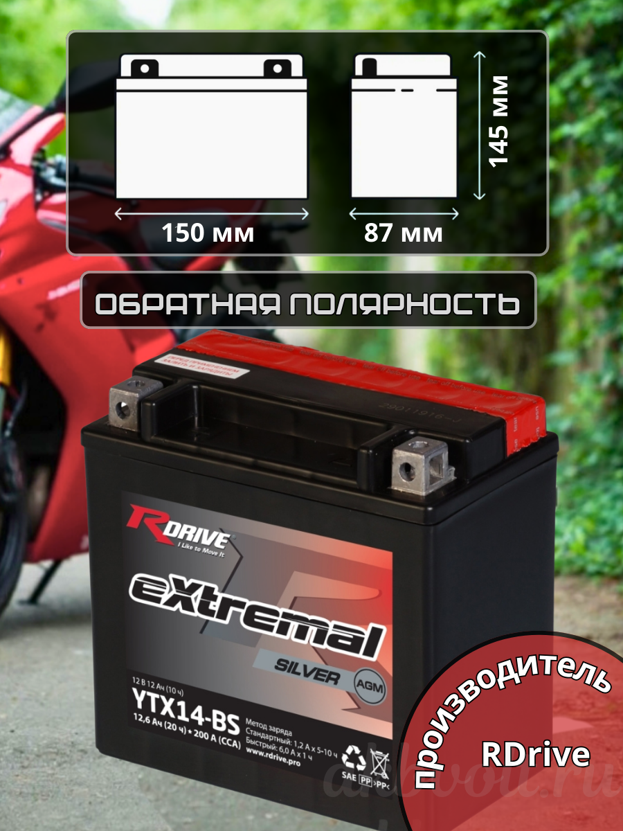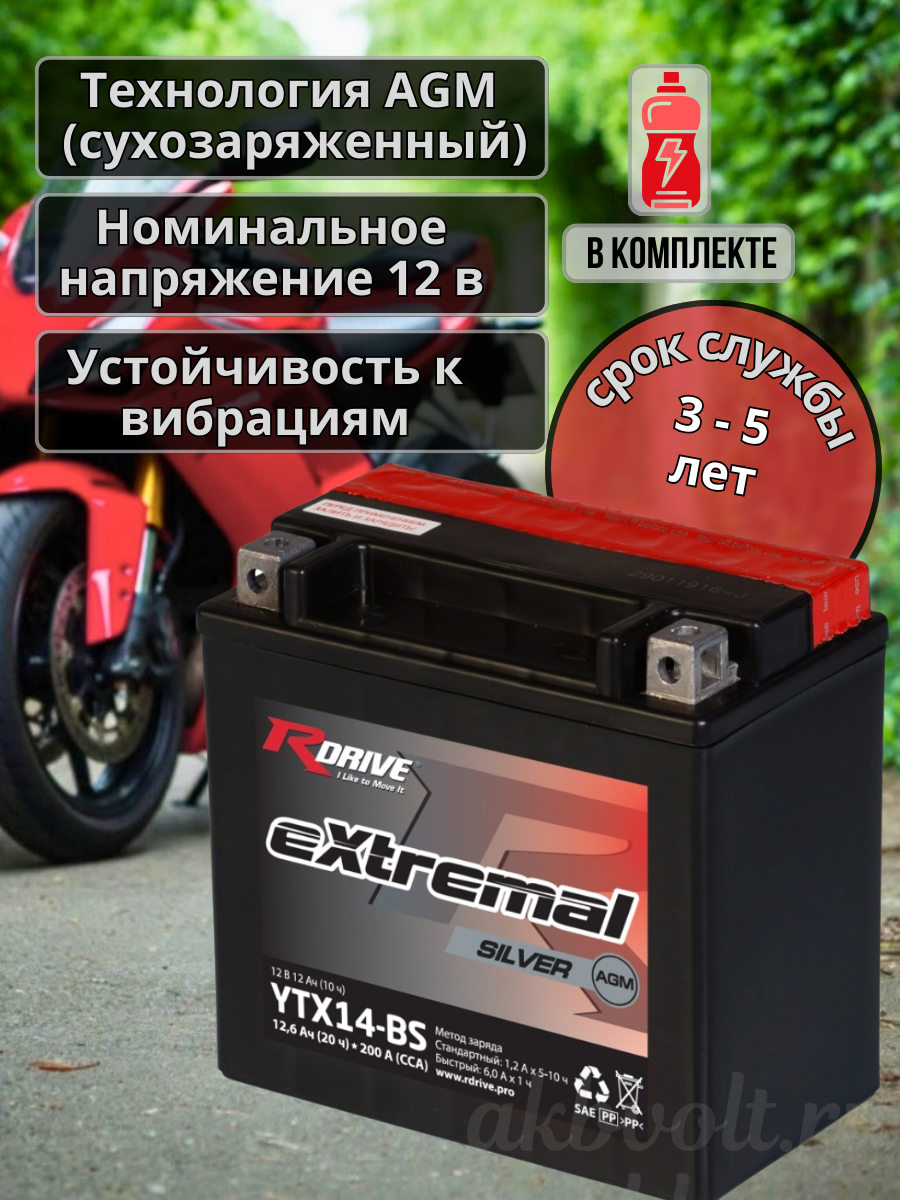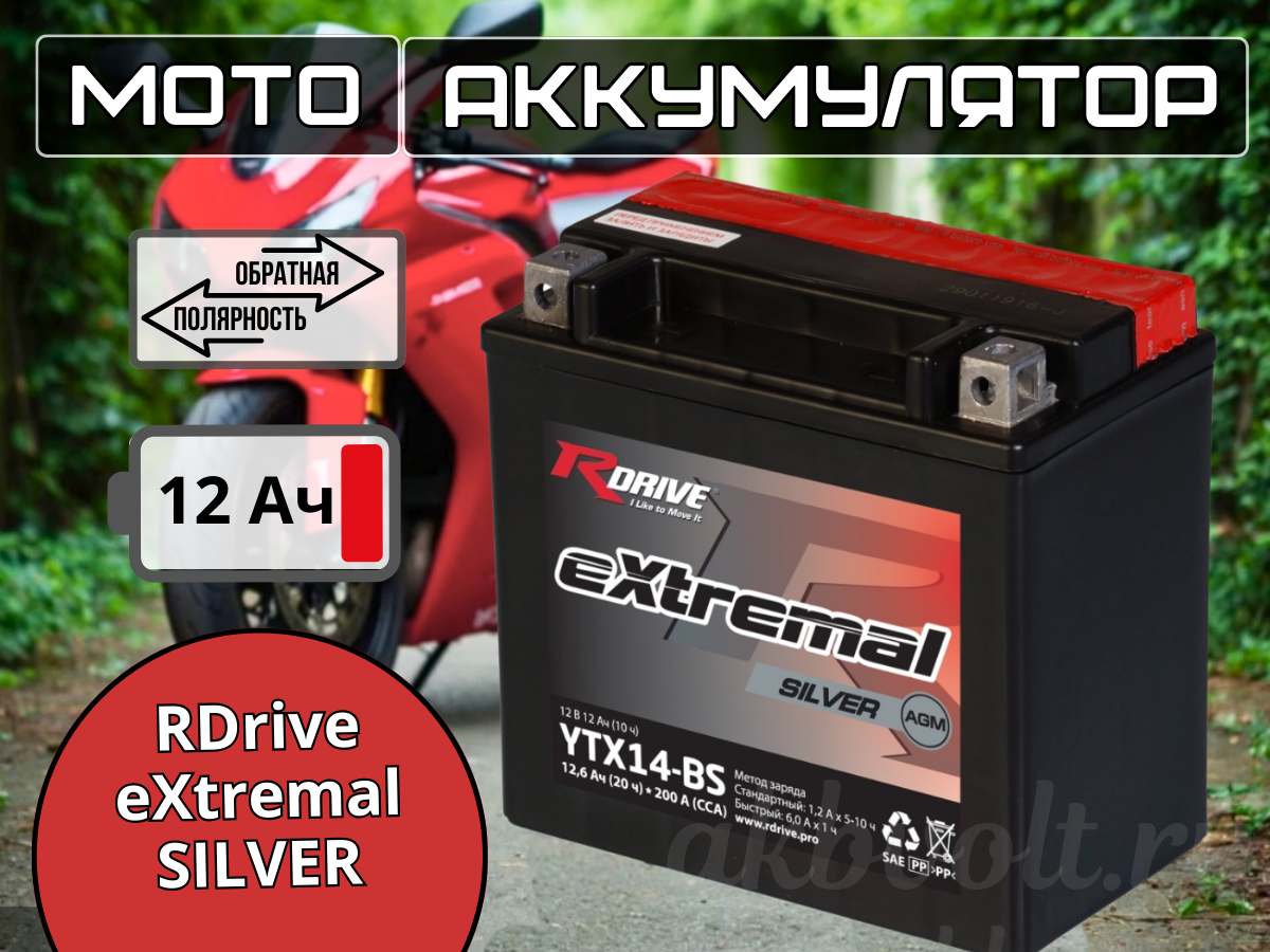 Мото аккумулятор RDrive eXtremal SILVER 12Ач прямая полярность YTX14-BS