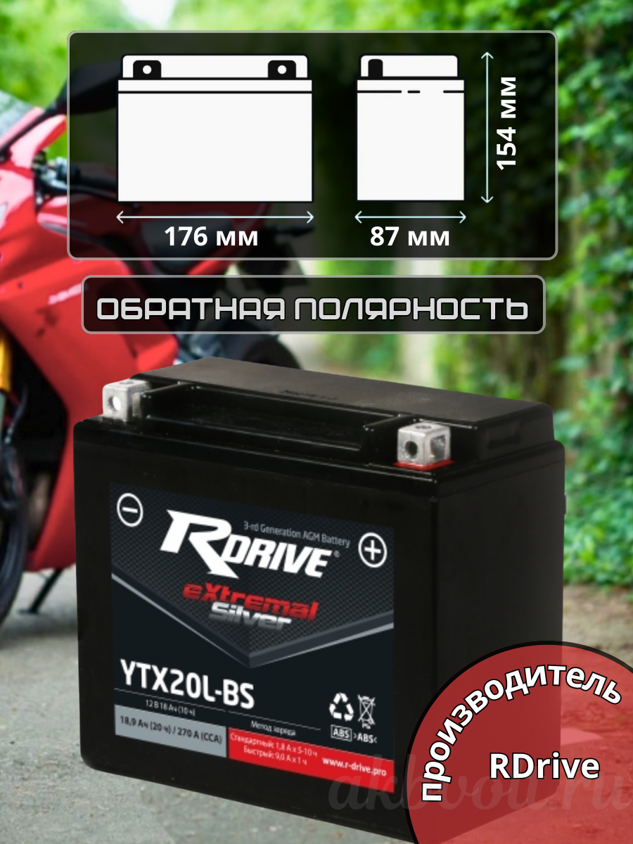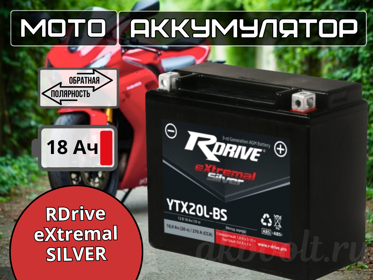 Мото аккумулятор RDrive eXtremal SILVER 18Ач обратная полярность YTX20L-BS