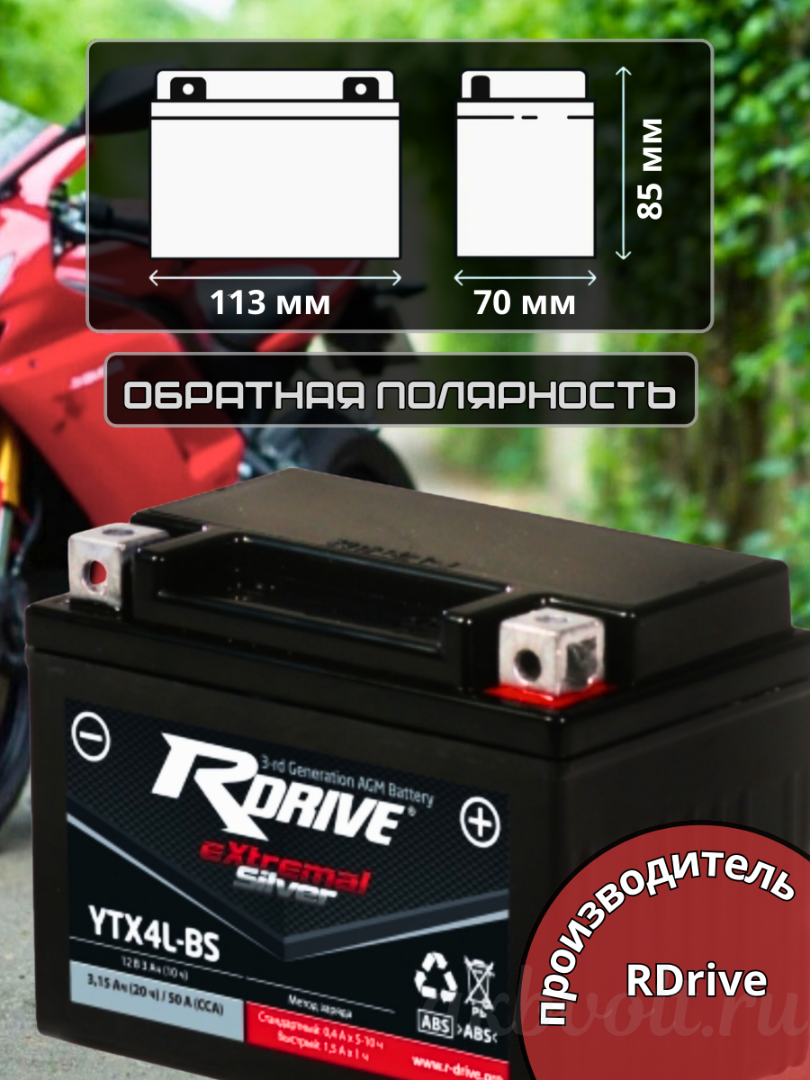 Мото аккумулятор мото RDrive eXtremal SILVER 3Ач обратная полярность YTX4L-BS