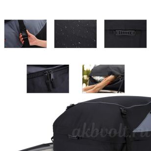 Сумка выполнена из прочных и водоотталкивающих материалов, что гарантирует надежность даже в неблагоприятных погодных условиях. Удобная конструкция позволяет легко устанавливать и снимать бокс, а его легкий вес не повлияет существенно на динамику вашего автомобиля.