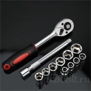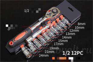♦ Головка -10, 11, 12, 13, 14, 15, 17, 19, 22, 24 мм -12шт. Трещотка 1/2": L=250 мм, 45 зубов -1шт. Удлинитель: L=125 мм -1шт.