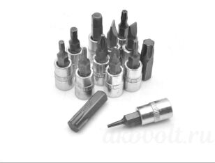 ♦ Торцевые головки со вставками 1/4": Удлинённые крестообразные: PZ1, PZ2, Шестигранные Hex: НЗ, Н4, Н5, Н6, Прямые: S10: S4, S5.5, S6.5, Torx: Т8, Т10, Т15, Т20, Т25, Т27, Т30, крестообразные Philips: PH1,PH2 Биты: Шестигранные Hex: H7, H8, H10, H12, Н14, Прямой шлиц: S8, S10, S12, Крестообразные Philips: PH3, PH4,