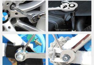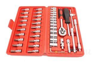 Несмотря на относительно небольшое количество предметов, в наборе собраны самые необходимые инструменты для обслуживания и ремонта автомобиля. Головки торцевые различных размеров, трещотка с удобным переключателем направления вращения, удлинители, карданный шарнир и набор отверточных бит позволяют выполнять работы по затяжке и откручиванию крепежа различных типов и размеров.