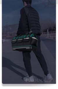 Сумка оснащена прочными ручками для переноски, а также регулируемым плечевым ремнем с мягкой накладкой, что обеспечивает комфорт при транспортировке даже при полной загрузке. Яркий зеленый цвет делает сумку заметной, что особенно важно при работе в условиях плохой освещенности.
