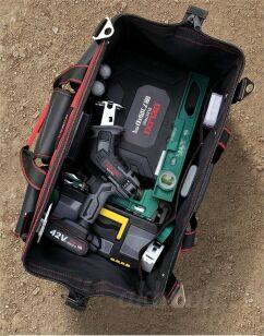 Сумка оснащена множеством внутренних и внешних карманов различных размеров, что позволяет оптимально организовать хранение инструментов. Вы сможете легко найти нужный инструмент, не тратя время на поиски. Удобные ручки и плечевой ремень обеспечивают комфортную транспортировку, даже если сумка полностью загружена. Усиленное дно защищает содержимое от повреждений и предотвращает деформацию сумки.