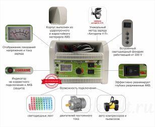 | Защита от: | перегрузки входного напряжения, короткого замыкания выходных зажимов, неправильного подключения к АКБ (переполюсовка), перегрева элементов прибора |